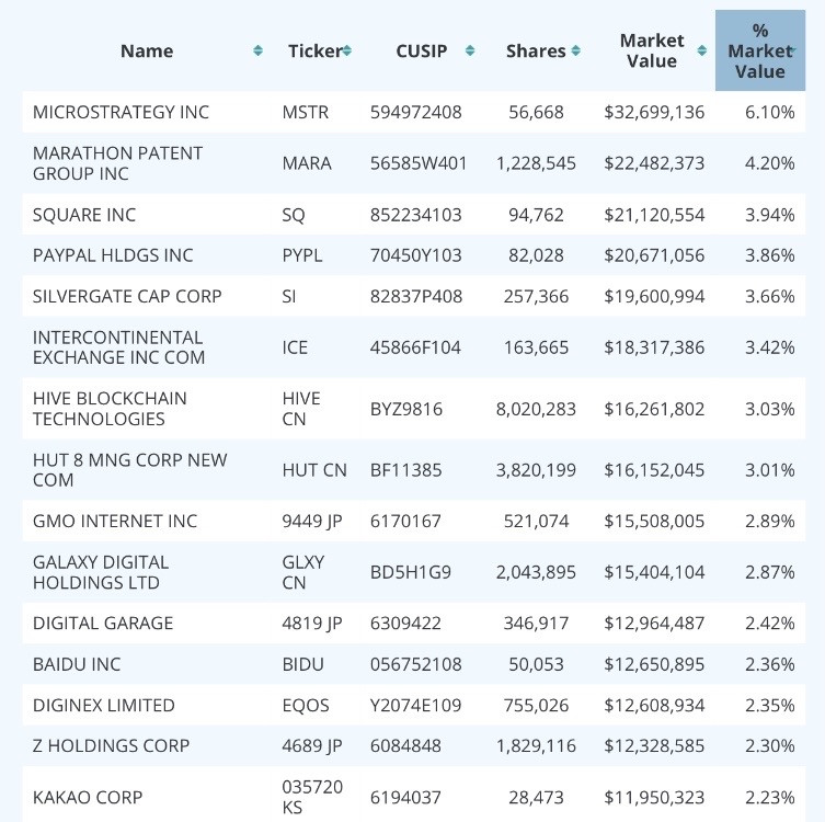 The best way to invest with lower risk is buy a basket of blockchain technology companies - Amplify Transformational Data Sharing ETF (BLOK). BLOK is an actively managed portfolio mainly consisting of global equities focusing on blockchain technology. BLOK top 15 holding: