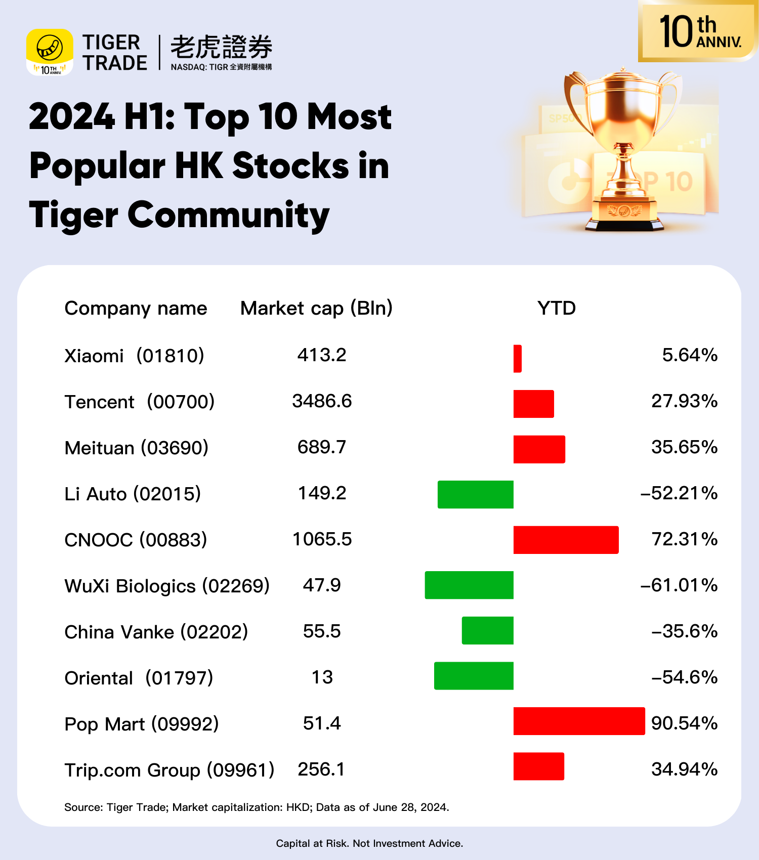 Here are the top 10 most popular Hong Kong stocks in Tiger Community in the first half of 2024: