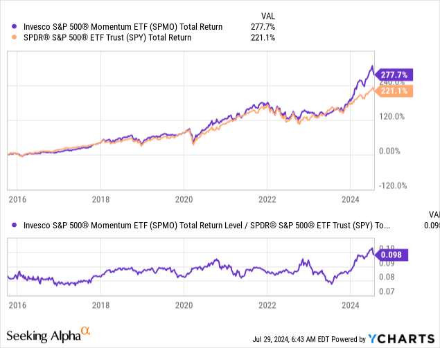 - SPMO has outperformed the iShares Momentum ETF, MTUM, with relative consistency since 2022, potentially because of its less risk-averse approach.