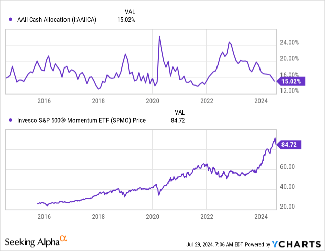 At any rate, the peaks and troughs in SPMO are generally aligned with those of individual investor cash balances. This is also true for most large-cap funds, but it is notable for SPMO in recent years, particularly in the most recent rally. When individual investor's cash allocations are high, such as in early 2023, 2020, 2019, and 2016, SPMO's subsequent performance has been strong. However, when cash balances are low, such as at the end of 2017, 2019, 2021, and today, SPMO has usually faced a sharp correction at some point over the following six months. See below: