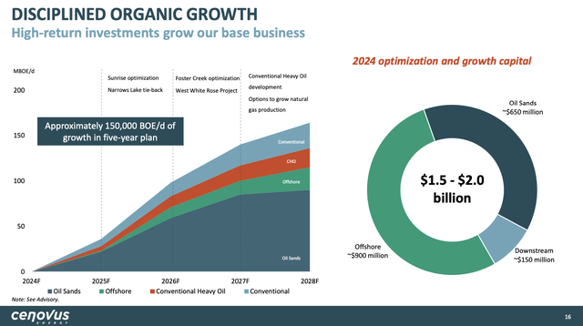 As projects like the Foster Creek optimization are going according to plan (expected to be online in 2016), the company is looking to add more than 150 thousand barrels per day in production by 2028, mainly supported by its oil sand operations.
