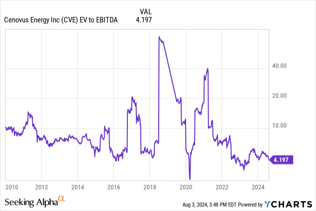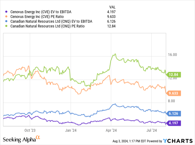 Cenovus trades at 4.2x earnings and 9.6x EBITDA. Canadian Natural trades at 6.1x earnings and 12.8x EBITDA.