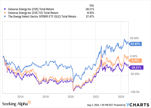 New York-listed CVE shares have returned a negative 28%, as the U.S. dollar/Canadian dollar currency pair was a headwind for non-Canadian investors over the past decade.