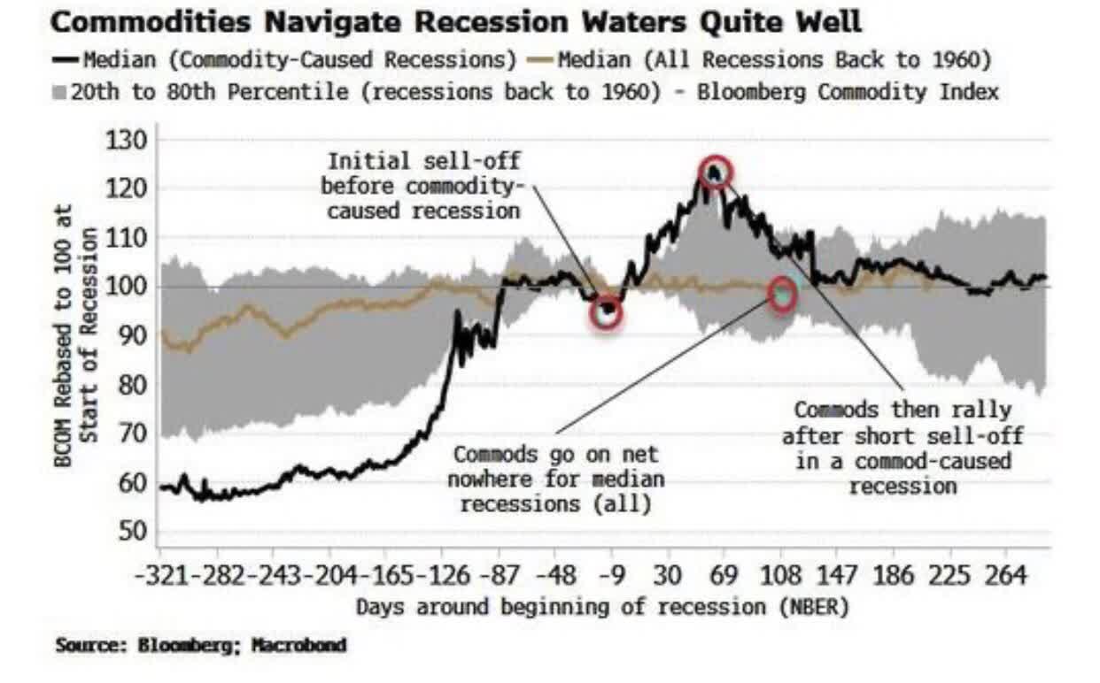 The good news is that historically speaking, commodities tend to rise through recessions, only selling off in the early phases of a recession. While this does not mean they are protectors against recession (oil is still cyclical), when underlying fundamentals are strong, sell-offs in commodities tend to offer great buying opportunities.