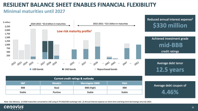 Speaking of low risks, the company has also de-risked its balance sheet. On top of hitting its debt target, it has repurchased most bonds that mature through 2026, resulting in a highly favorable maturity profile with a weighted average duration to maturity of 12.5 years.