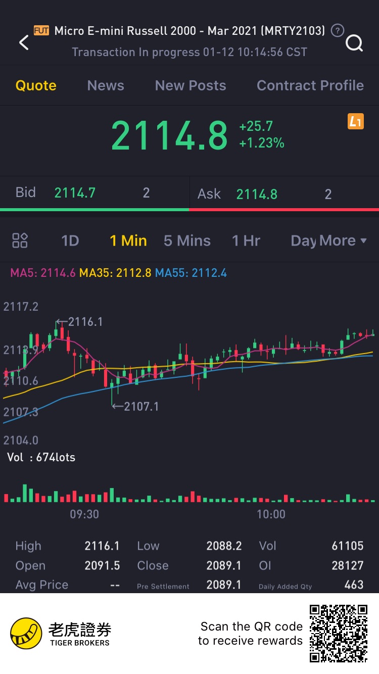 My humble view. Russell 2000 break new high again on Tuesday 12 Jan 2021. High of 2118.2, await Joe Biden to take over as 46th. US President on 20 Jan 2021