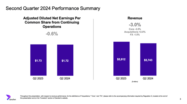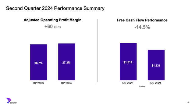 For example, while 2Q24 core sales were down 3.5% to $5.7 billion, the adjusted operating margin improved by 60 basis points to 27.3%. This was mainly due to the successful implementation of cost-saving initiatives that offset lower volumes.