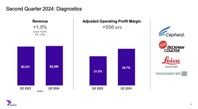 With that in mind, just one of the company's segments saw growth in the second quarter. That segment was Diagnostics, which had 3.0% core growth and 550 basis points higher operating margins to 26.7%.
