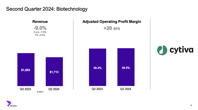 Then there's Biotechnology, a segment dominated by Cytiva. It saw 7% lower core revenue growth but kept strong operating profit margins of almost 40%.
