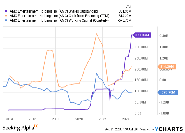 Going back to 2020, I have had a bearish outlook on AMC Entertainment Holdings, Inc. (NYSE:AMC). In my view, the company's core issues were growing rapidly in the years before 2020 but were greatly exacerbated that year. Of course, from an investment standpoint, it eventually came out ahead as it gained so much "meme stock" traction that its equity value rose enough that it sold shares and raised significant capital. The company has worked hard at burning that capital since, seeing its working capital fall from nearly $500M to -$575M in Q2 2024.