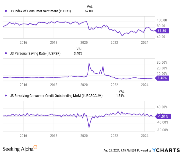 Previously, my view on AMC was that its operational position should remain decent, while its balance sheet was alarming. Since then, its balance sheet has remained concerning, but the extension of maturities pushes that issue into 2029. However, as I've discussed in many articles, we're also seeing more clear negative trends in consumer data. From 2022 to 2023, economic weakness was isolated mainly to the manufacturing sector. Today, there are clearer signals that people are reducing luxury spending due to lower discretionary incomes.