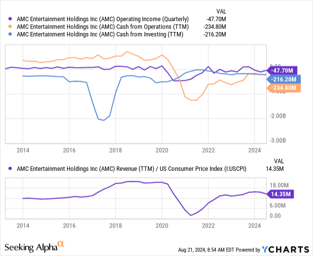 I believe any benefits from its debt maturity are offset by lower operating income and inflation-adjusted revenues. It may be that its sales are falling due to weakened consumer spending or the long-term impacts of the Hollywood strikes last year. As I detailed in my previous AMC article, I viewed the strikes as a significant negative headwind facing the stock in 2024. The company confirmed it faced issues from this in Q2; however, it may be that it points to the problem of covering for naturally lower demand. Many large movies have been released throughout 2024 but have had far lower box office performance than hoped.