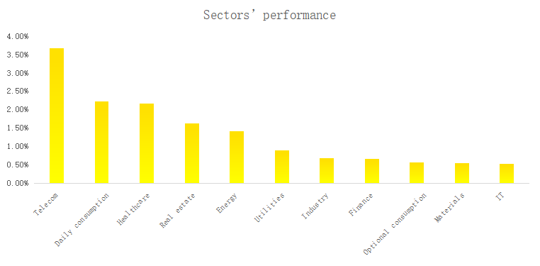 Looking at the sectors, all segments saw gains this week, with telecom services, consumer goods, healthcare, and real estate leading the charge.