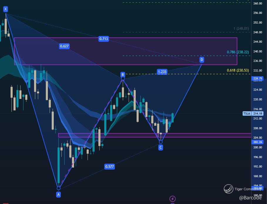 Tuesday is a fantastic day to be bullish on Tesla! After carefully observing the market, Iโve watched Tesla bounce like a kangaroo off my $202.00-$203.00 buy zone, hopping up $11.00 from the lows. Now, Iโm keeping my eyes on the prize as Tesla flutters into the harmonic C to D wing. Let's dive into the Fibonacci rabbit hole together!
