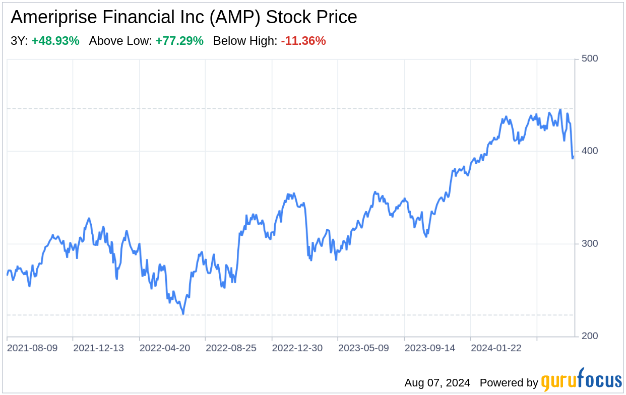 Ameriprise Financial Inc (AMP, Financial), a leading asset and wealth management firm, has reported its financial results for the second quarter of 2024. The company has showcased a strong performance with a significant increase in management and financial advice fees, which rose by 16% compared to the previous year. This growth is attributed to an increase in average wrap account assets, reflecting market appreciation and net inflows. Net investment income also saw a notable rise of 16%, primarily due to higher average invested assets and the favorable impact of increasing short-term interest rates. Despite these positive trends, Ameriprise Financial Inc faces challenges, including net outflows in asset management and the need to remain competitive in a dynamic market environment.