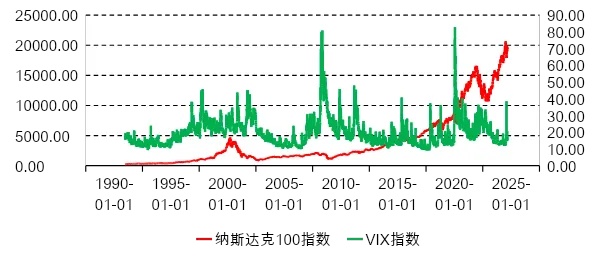 The picture shows the comparison of the trends of the Nasdaq 100 Index and the VIX Index