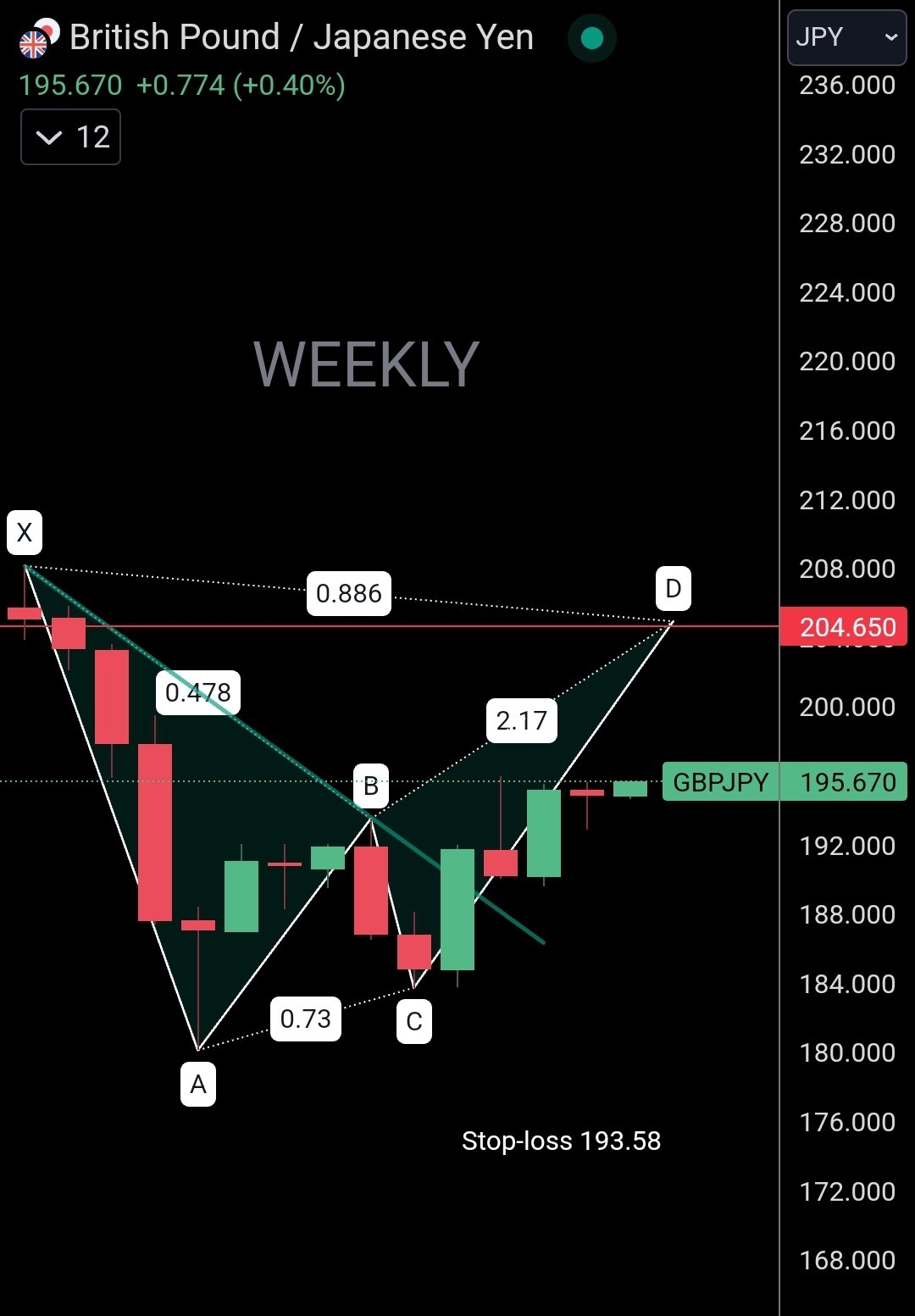 $GBP/JPY(GBPJPY.FOREX)$ Potential bat pattern developing GBPJPY. Projected price target 204.65