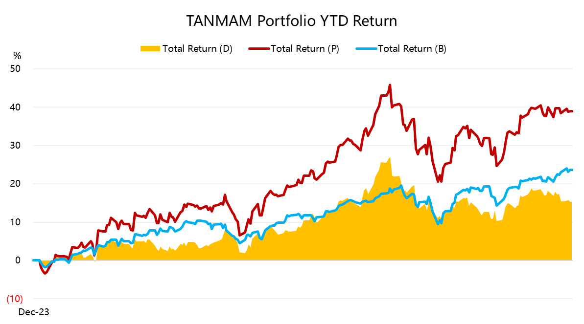 Big tech stocks were strong this week, with the portfolio returning 38.97% year-to-date, outperforming the SPY's 23.68%.