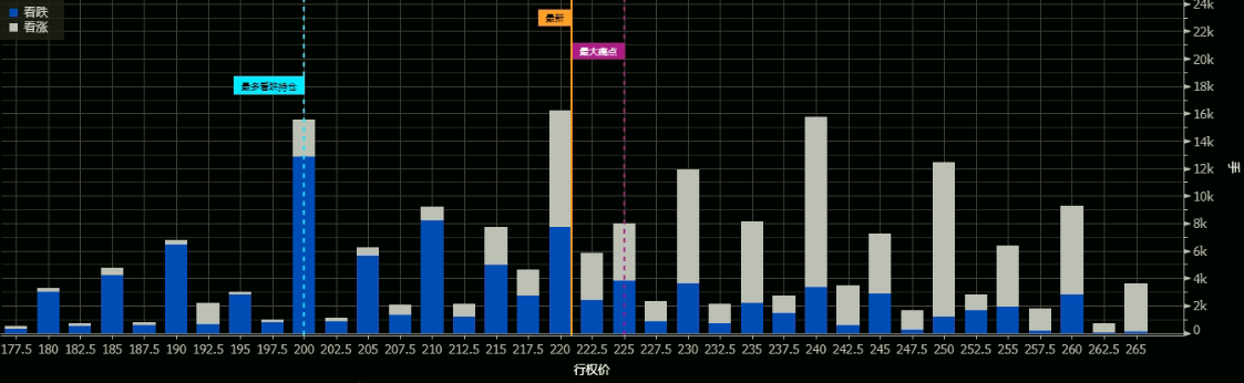 TSLA's IV Rank is currently just 47% and its IV Percentage is just 74%, which is very low for the week before earnings.Gaming the big swings during earnings season could become a much more cost-effective way to go.From the distribution of options on 25 October, the largest pain point in $ 225, higher than the current price, and 240, 250, 260 Call distribution are relatively large, while the open PUT is relatively small, basically concentrated in the 200 round number off.