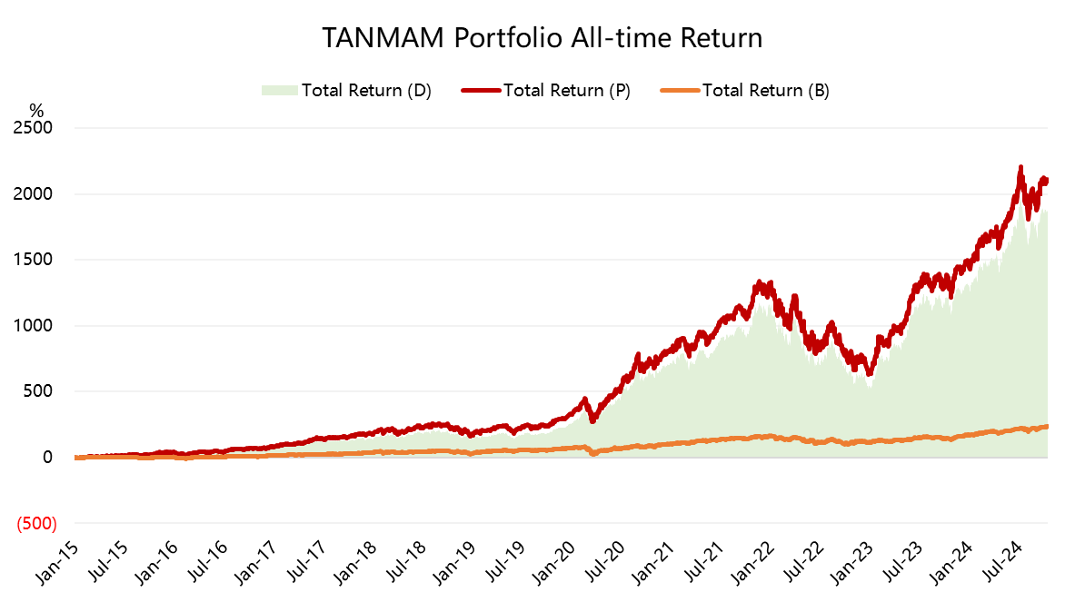 The Magnificent Seven form a portfolio (the "TANMAMG" portfolio) that is equally weighted and reweighted quarterly.The backtesting results are far outperforming the S&P 500 since 2015, with a total return of 2,098.3%%, while the SPY returned 236.4% over the same period, again pulling ahead.