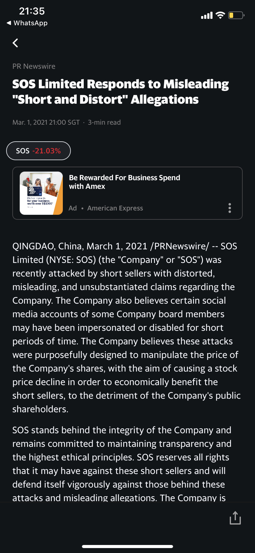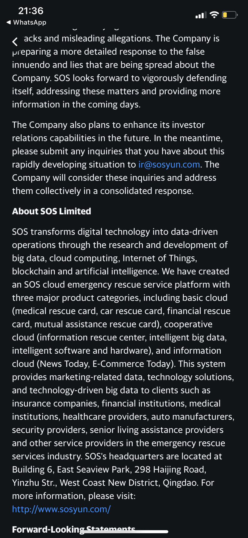 $SOS Limited(SOS)$cannot paste link here. Source: pr newswire