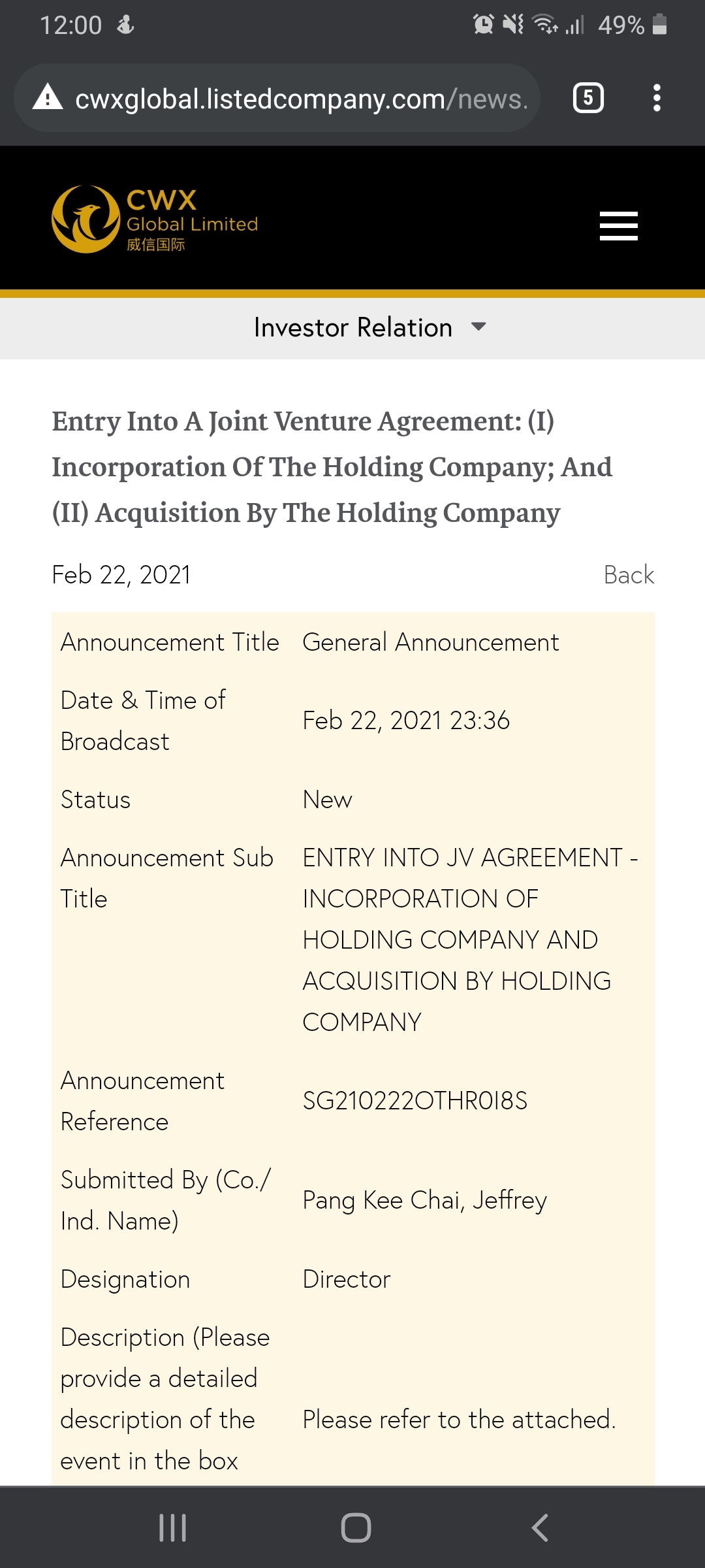 $CWX GLOBAL LIMITED(594.SI)$Currently CWX Global is undergoing a joint venture talk, await for the release of announcement in the upcoming days. Good news coming.