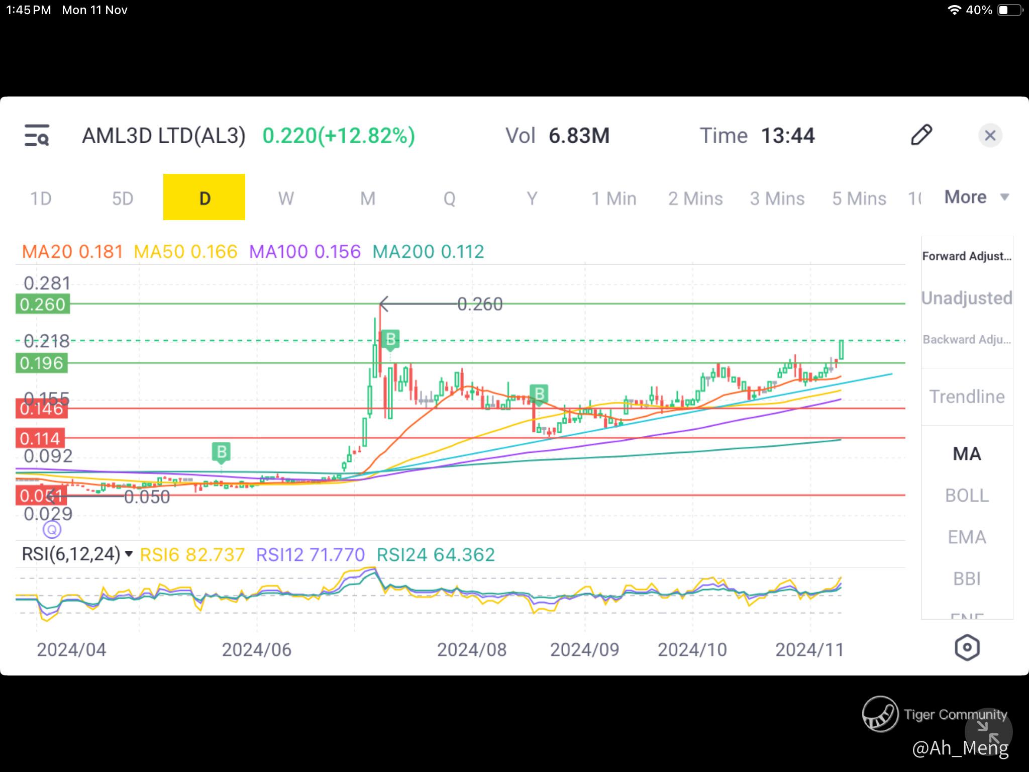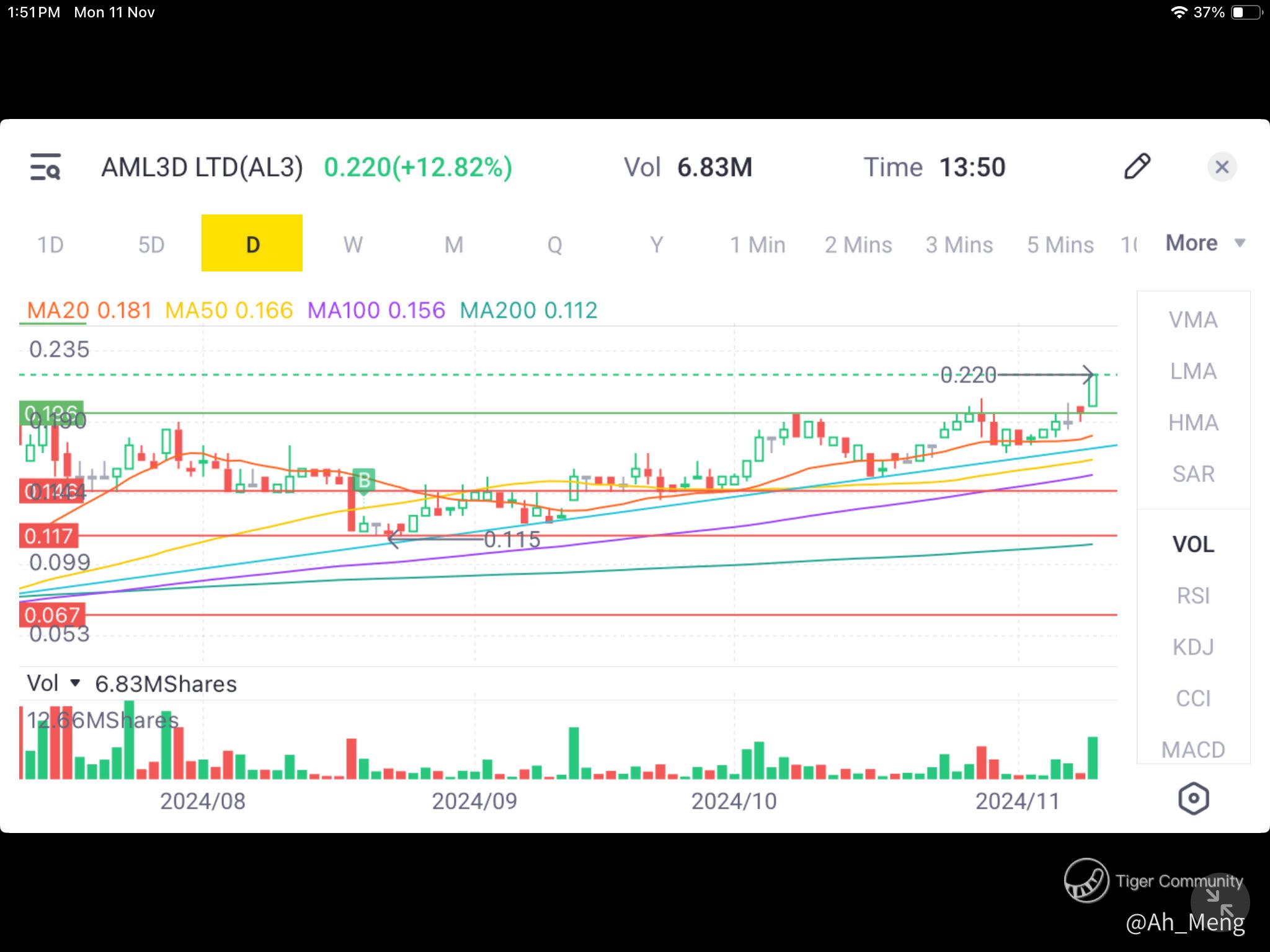 $AML3D LTD(AL3.AU)$ Moving back up... you can see from the green line I have drawn near 19.6 cents, breakout has occurred last Friday and the price action has moved the chart nicely to 22 cents currently with an increasing volume (see chart 3). Chart 2 also shows a higher highs and higher lows formation all the way from the corrected low of 11.5 cents around September period.