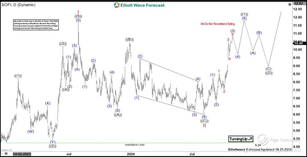 As mentioned in the last article, SOFI confirmed bullish sequence as it broke above July-2023 high. Currently, it favors upside in (3) of ((1)) & expect rally to finish sequence from August-2024 low between $13.51 – $18.13 area. Later, it should pullback in ((2)) in 3, 7 or 11 swings, which provide buying opportunity.