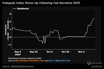 Bloomberg Economics’ Fedspeak index has become more hawkish after the November Fed rate cut, indicating officials are taking a more measured position towards additional easing, driven especially by Fed Chair’s Nov 14 remarks emphasis patience given US’ economic strength and October inflation data showing a “bigger bump” than expected.