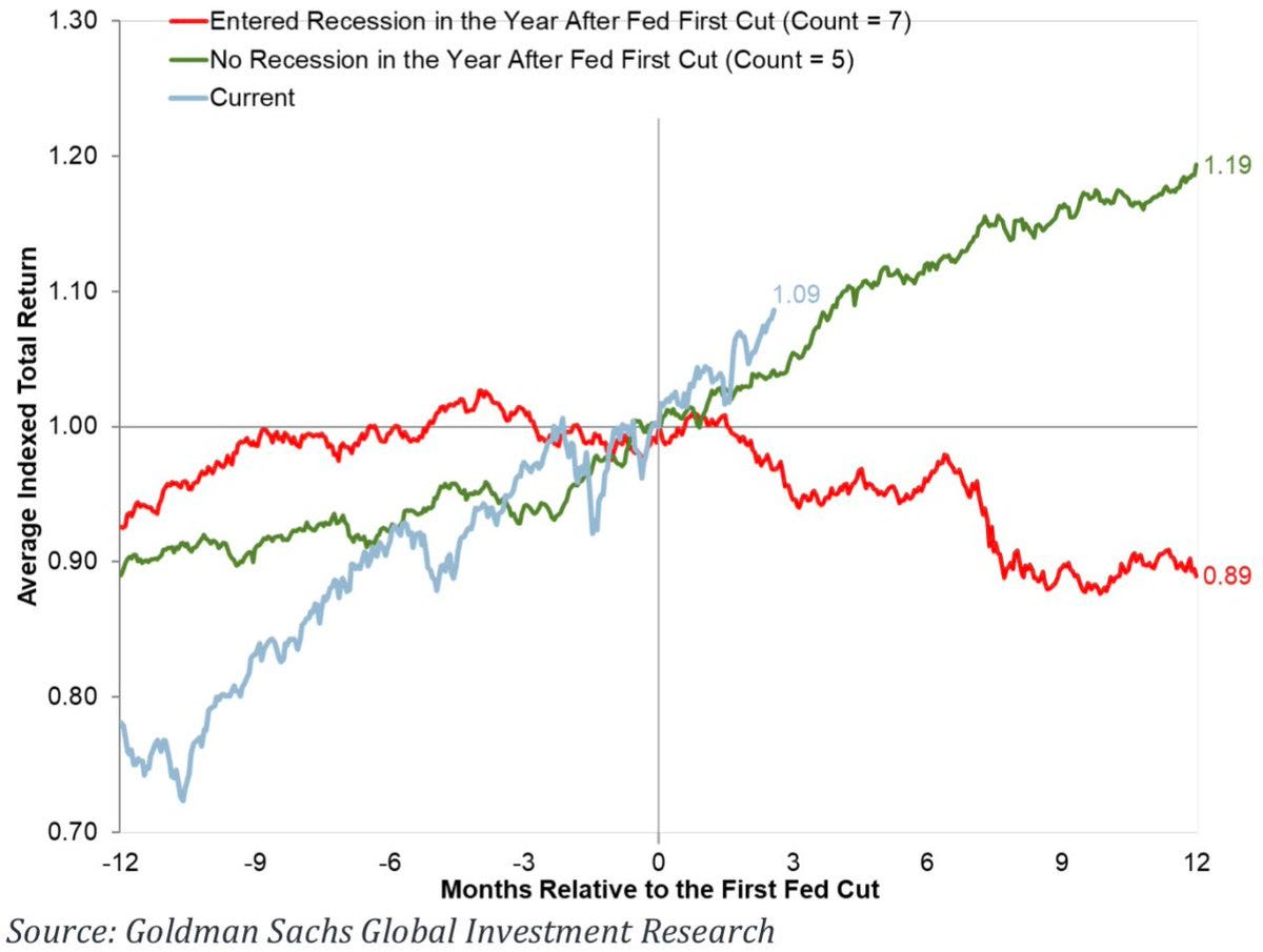 5. Rate Cut Trading: This chart shows the average path of markets before and after the first Fed rate cut when a recession happened (red line) and when one did not happen directly after the Fed began rate cuts (green line). For now the current path of markets is consistent with the “no recession” line. In other words, the market is trading as if this is a non-recessionary rate cut. And if true, that’s bullish, it would mean more upside to come.