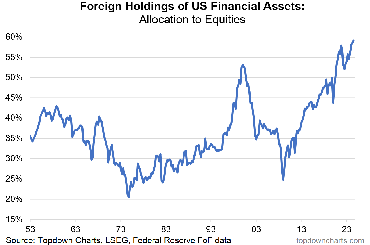 4. Foreign Fervor: Foreigners are rotating more and more into US equities. Another record high on this indicator in Q3. Compare and contrast the heights of the dot com bubble vs the depths of the financial crisis in terms of what this chart means.