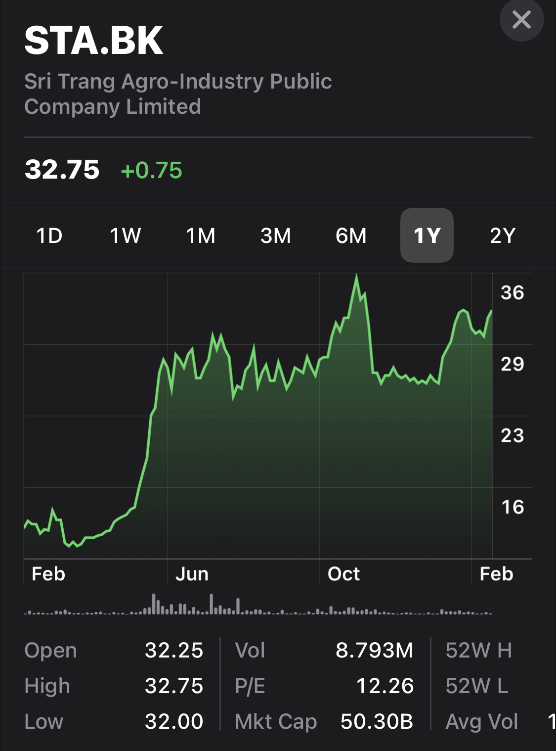 $SRI TRANG AGRO-INDUSTRY PCL(NC2.SI)$STA in Bangkok Exchange currently $1.45 vs $1.42 in SGX Exchange. Tonight result and dividend good then gap up! To the moon...