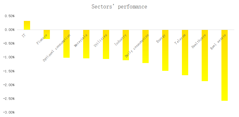 The market saw broad declines across most sectors this week, except for information technology. Real estate and healthcare were the hardest hit.