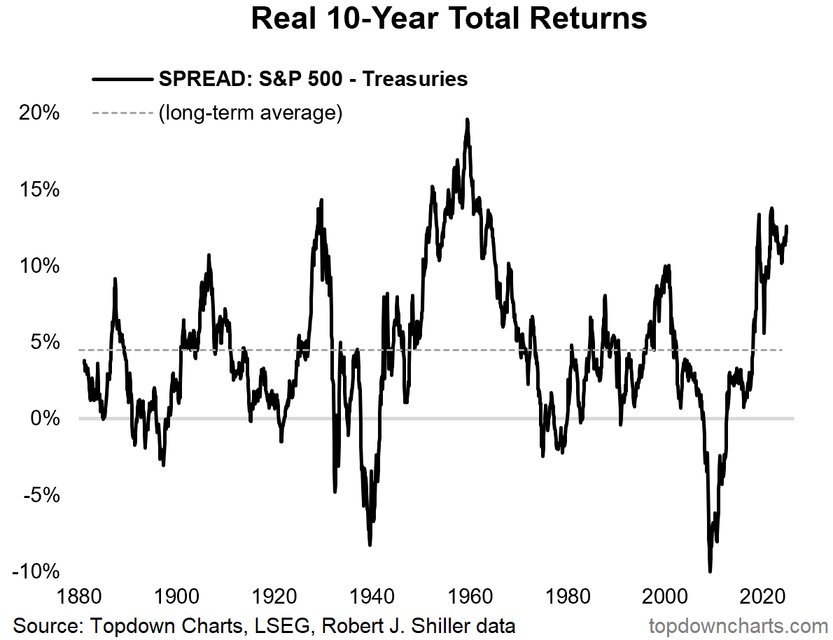 6. Realized Equity Risk Premium: Speaking of asset allocation, for the past 10-years investors have been handsomely rewarded for owning stocks rather than bonds, with the rolling realized equity risk premium well above long-term average. And here comes the “but” — problem is this thing is quite cyclical, and it looks late cycle. The implication being that maybe the subsequent 10-year realized equity risk premium may not be as good… time will tell, and charts will give clues.