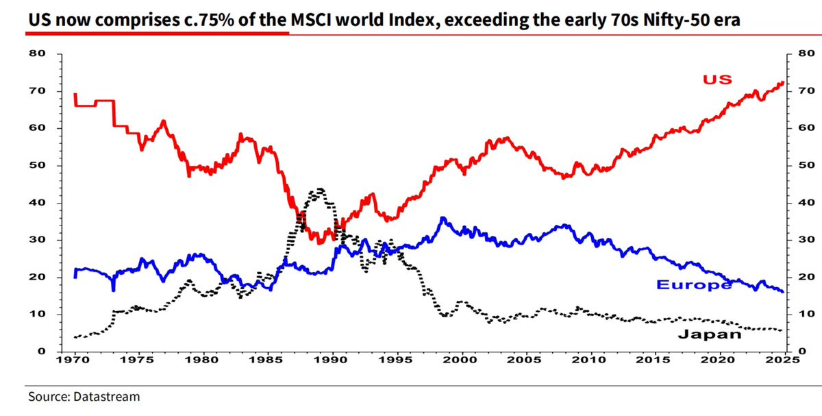 2. US Market Cap vs the World: Another market-cap milestone was set this year — the US stock market cap weighting in developed market equities reached a new high. Again this is interesting because of how it reflects US dominance, but also the subtle nod to future risks vs opportunities… it’s rare to see trends like this go on forever, and when they become extended like this it’s more common to see an eventual reversal.