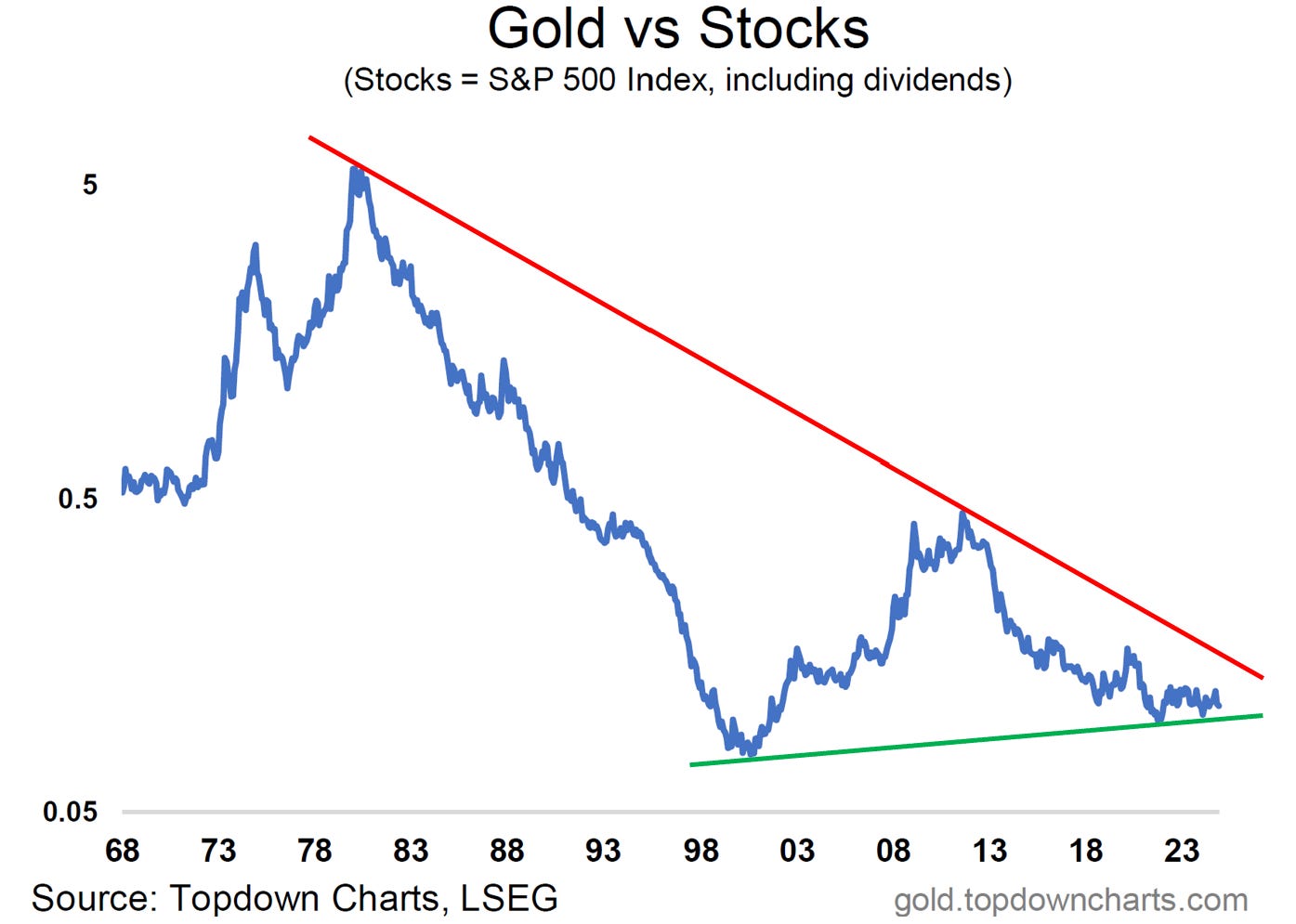 5. Gold vs Stocks: Speaking of bull markets, despite the epic bull run in gold, it’s “only” just keeping pace with stocks for now (both are sitting around 26% YTD as I write). And the gold vs stocks relative performance ratio has yet to turn the corner. Probably the main way that this chart would turn up (if it does) would be if stocks roll over into correction/bear market, and gold either holds ground or continues to move higher. Interesting chart because of its implications for asset allocation, but also because of that epic 30-year triangle pattern.