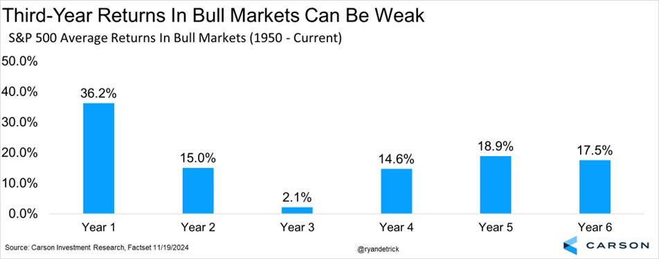 4. Third-Year Bulls: This year saw the beginning of the 3rd year of the cyclical bull market that began from the low in October 2022. And as it seems, the 3rd year can be frustrating. The bright side is that if we make it through to October 2025 without the bull market ending, then there could be some good further years to follow. The downside however is obvious.
