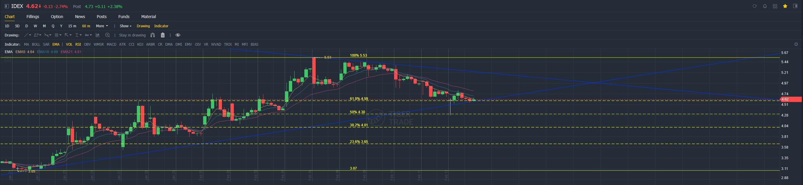 $Idex ASA(IDEX)$ currently sitting at the support line after failing to hold the next hidden resistance. Pennant breakout is expected next week.