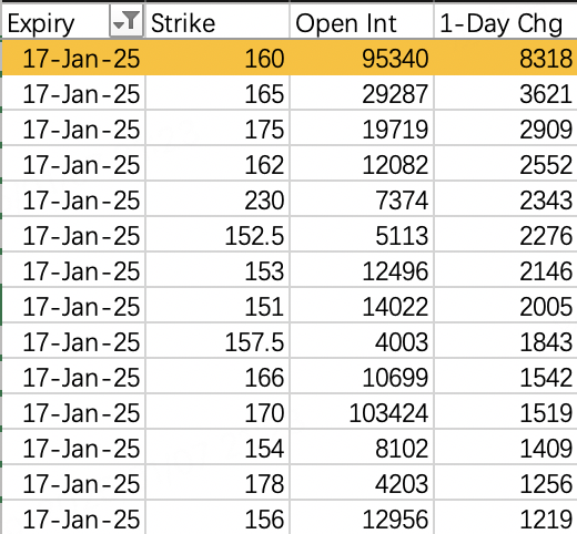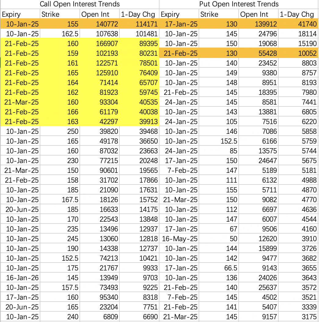 Monday's options open interest details show surging call option positions at the top. Excluding spread strategy positions in 155 and 162.5 calls, February expiry calls with strikes 158-166 saw massive increases in open interest, ranging from 40,000 to 89,000 new contracts.