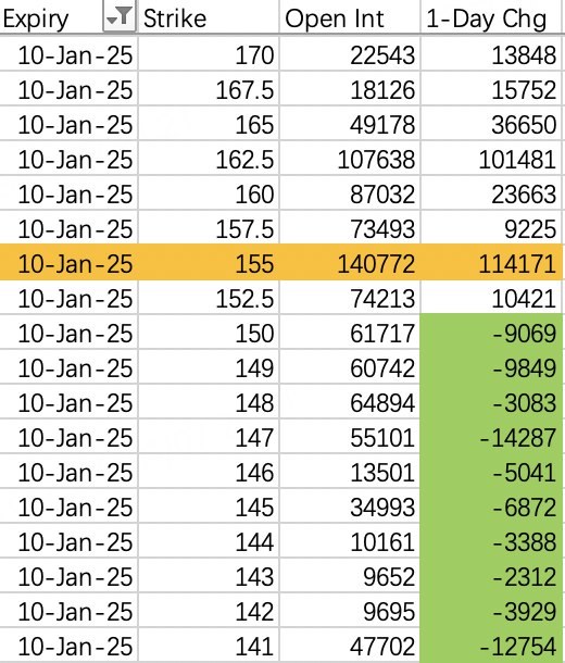Below are this week's call option opening details. Calls below 150 saw massive position closures, while 155 gained 114,000 new open interest, becoming the highest open interest call. This suggests price likely stays below 155 this week, with a small chance of breaking through to 160.