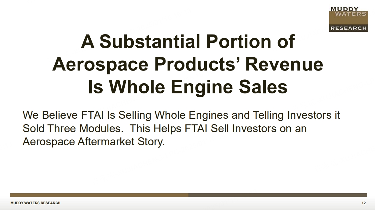 Muddy Waters is short $FTAI AVIATION LTD(FTAI)$ because its financial reporting is highly misleading. Their revenue from true maintenance and individual off-the-rack module sales are materially lower than reported, misleading investors by reporting one-time engine sales as Maintenance Repair & Overhaul revenue in its Aerospace Products segment.