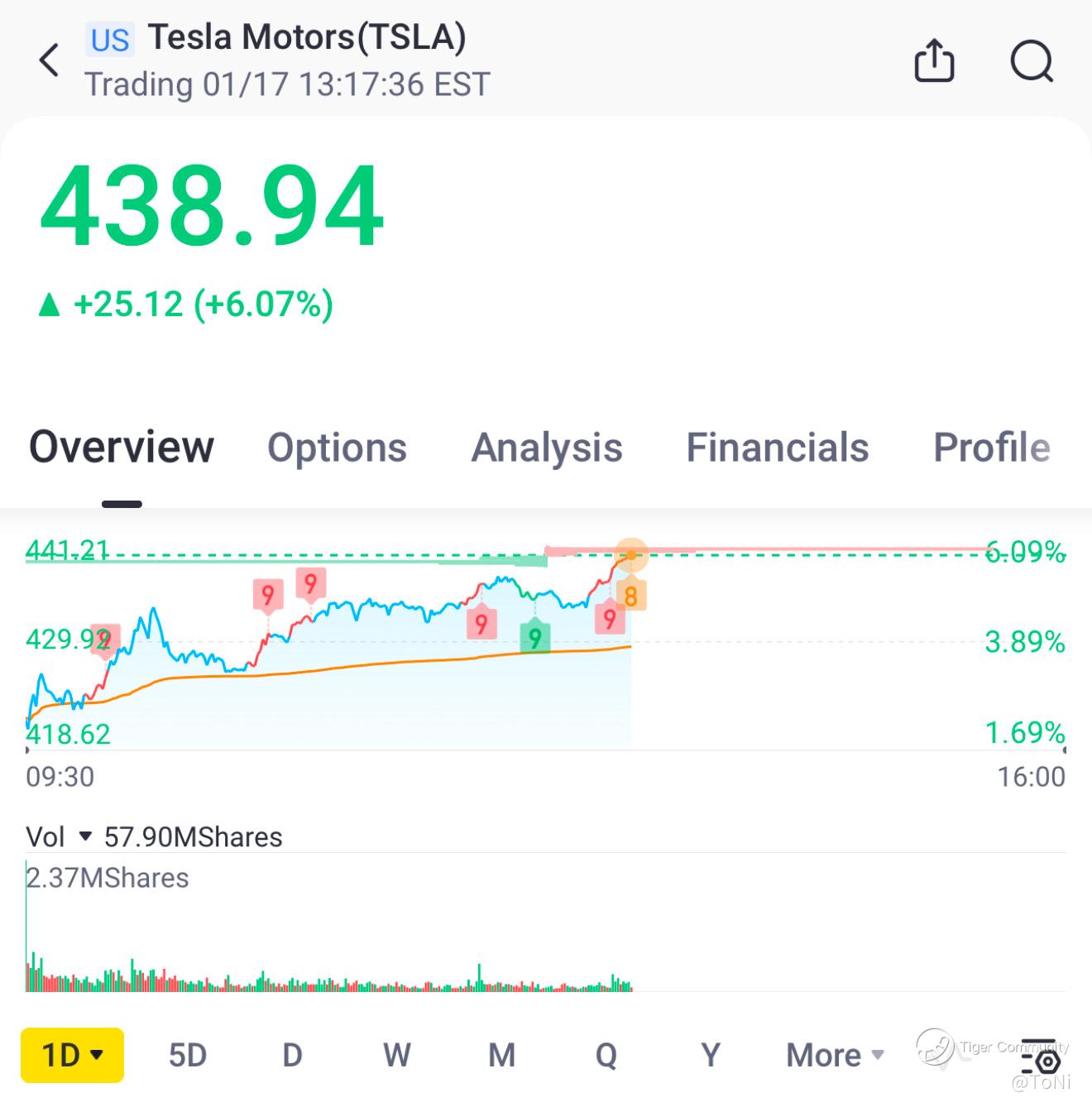 Tesla (TSLA) had a strong trading session today, surging 6.07% to close at $438.94. The stock showed steady upward momentum throughout the day, starting at $418.62 and reaching a high of $441.21.