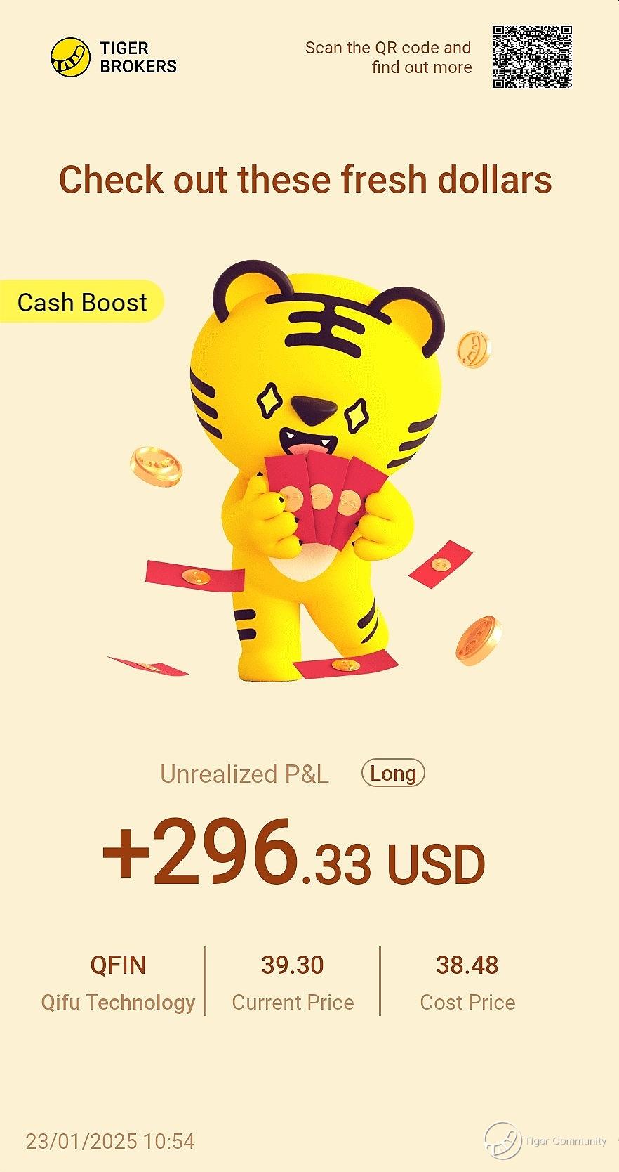 $Qifu Technology(QFIN)$ Recently, I made some gains, and QFIN really delivered! The company announced a new stock buyback program, planning to repurchase up to $450 million worth of shares over the next year, which adds more support to the stock price. Plus, their advancements in AI technology are remarkable, with a related paper being accepted by ICASSP 2025, showcasing their strong tech capabilities. The profits this time aren't huge, but I'm optimistic about the company's future! Big thanks to CBA as well!