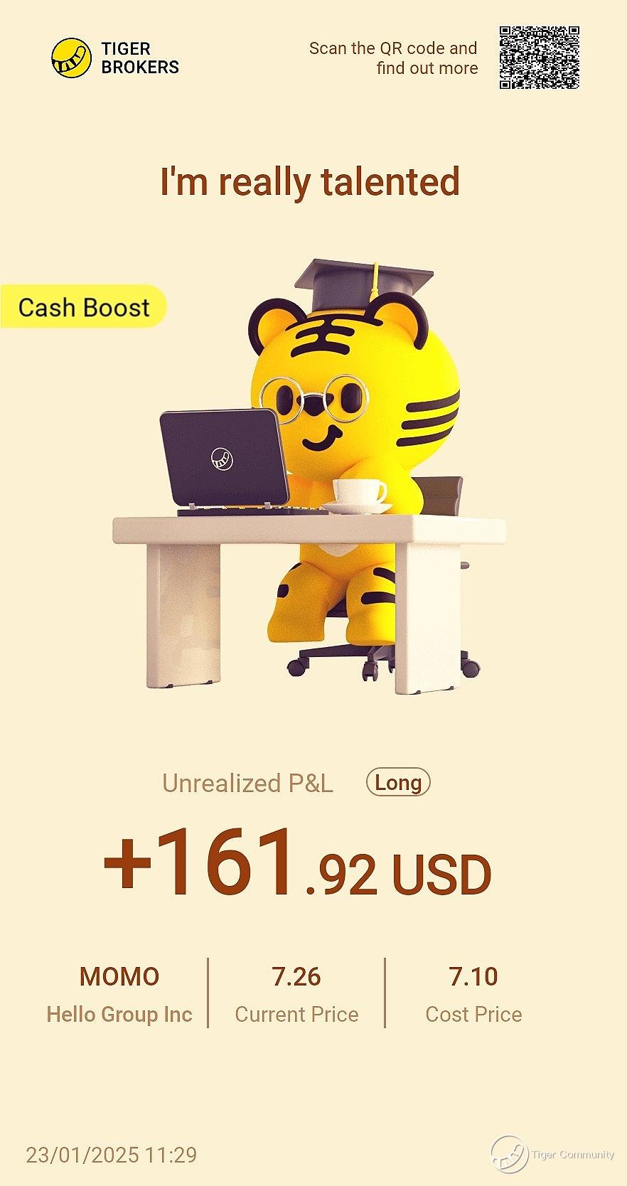 $Hello Group Inc(MOMO)$ Feeling great today as I locked in some small profits with Hello Group Inc! Recently, MOMO's stock has been quite steady. According to its latest earnings report, MOMO's revenue fell 12% year-over-year, and net profit dropped by 63%. However, the market response has been relatively stable, and the stock has been consolidating at lower levels. This gave me a nice short-term opportunity, and I managed to enter at just the right time! Big thanks to CBA!