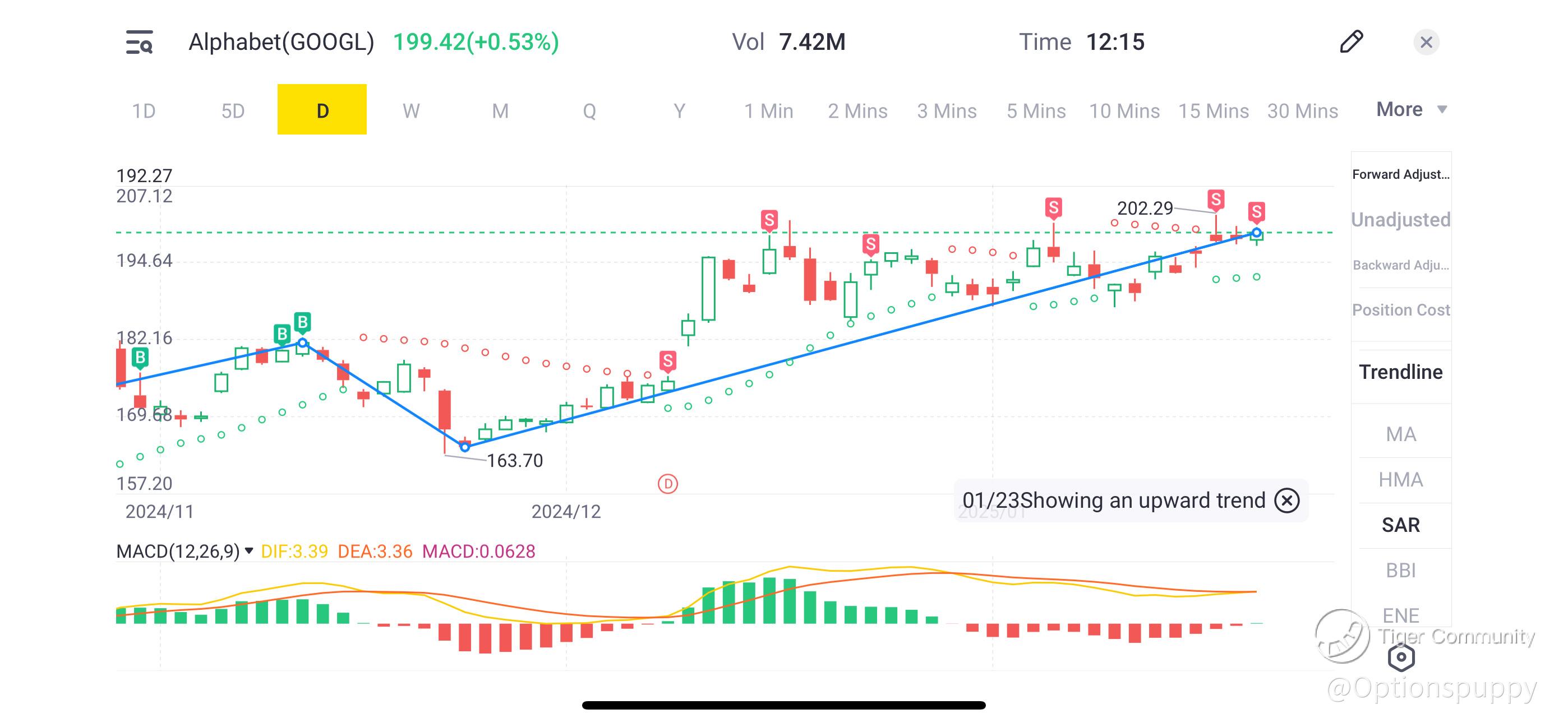1. The SAR confirms a bullish trend for GOOGL, but price is nearing resistance at $202.29.