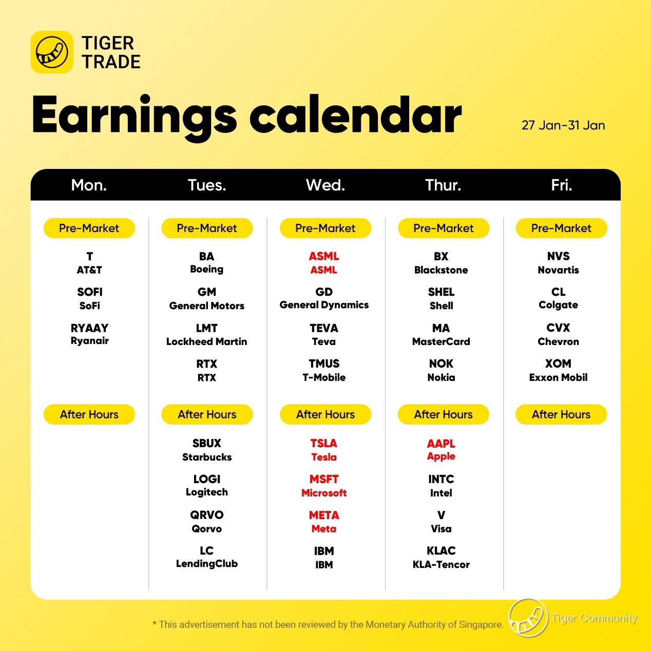 4. Next week, major tech companies like $ASML Holding NV(ASML)$ $Tesla Motors(TSLA)$ $Microsoft(MSFT)$ $Apple(AAPL)$ will release earnings reports, which could significantly impact both Hong Kong and US stock markets.
