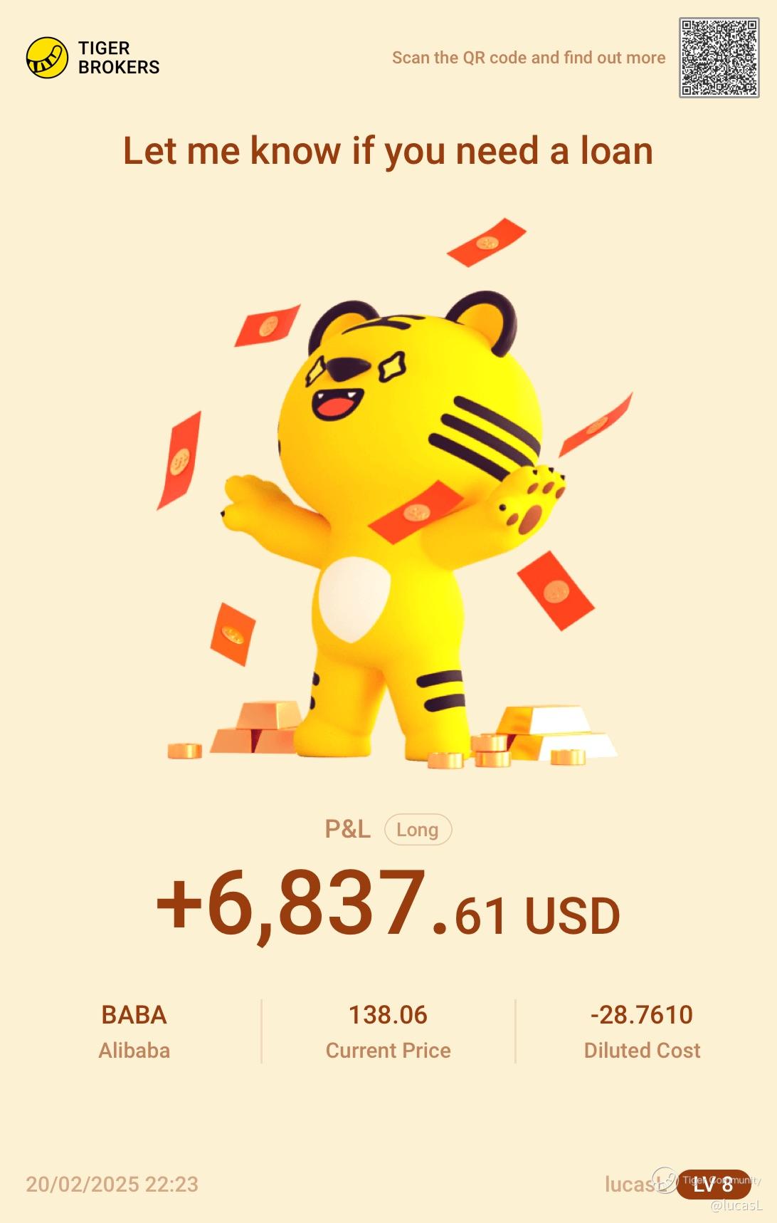 $Alibaba(BABA)$ time to show off my gain. Diluted cost is negative. Meaning my Alibaba shares are actually free after all my trading. LOL