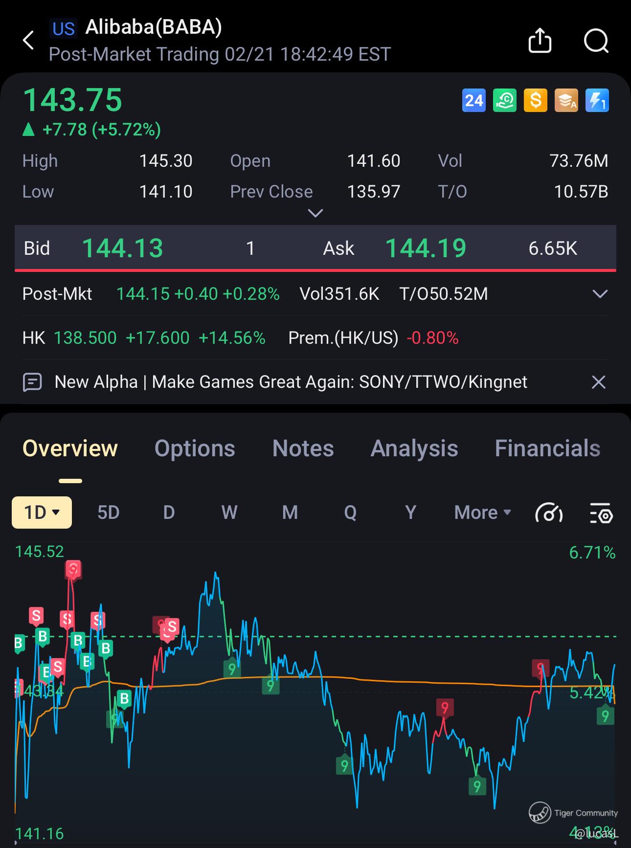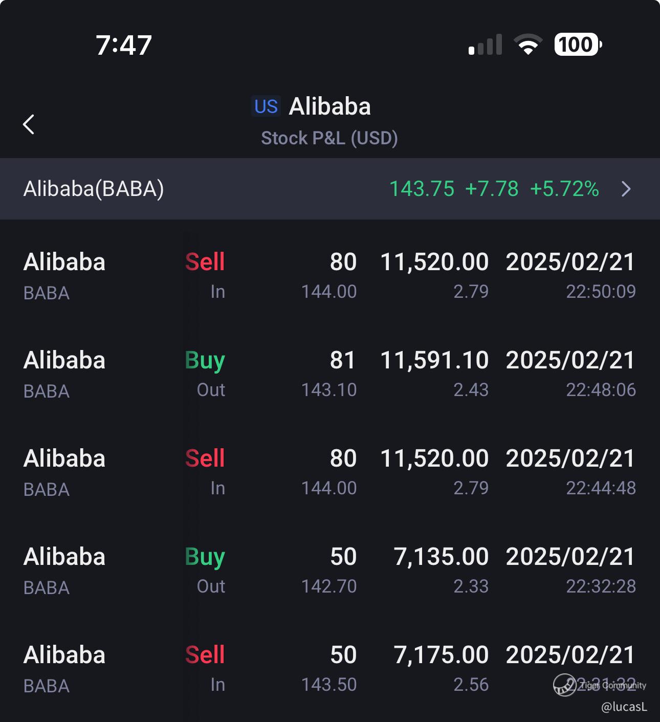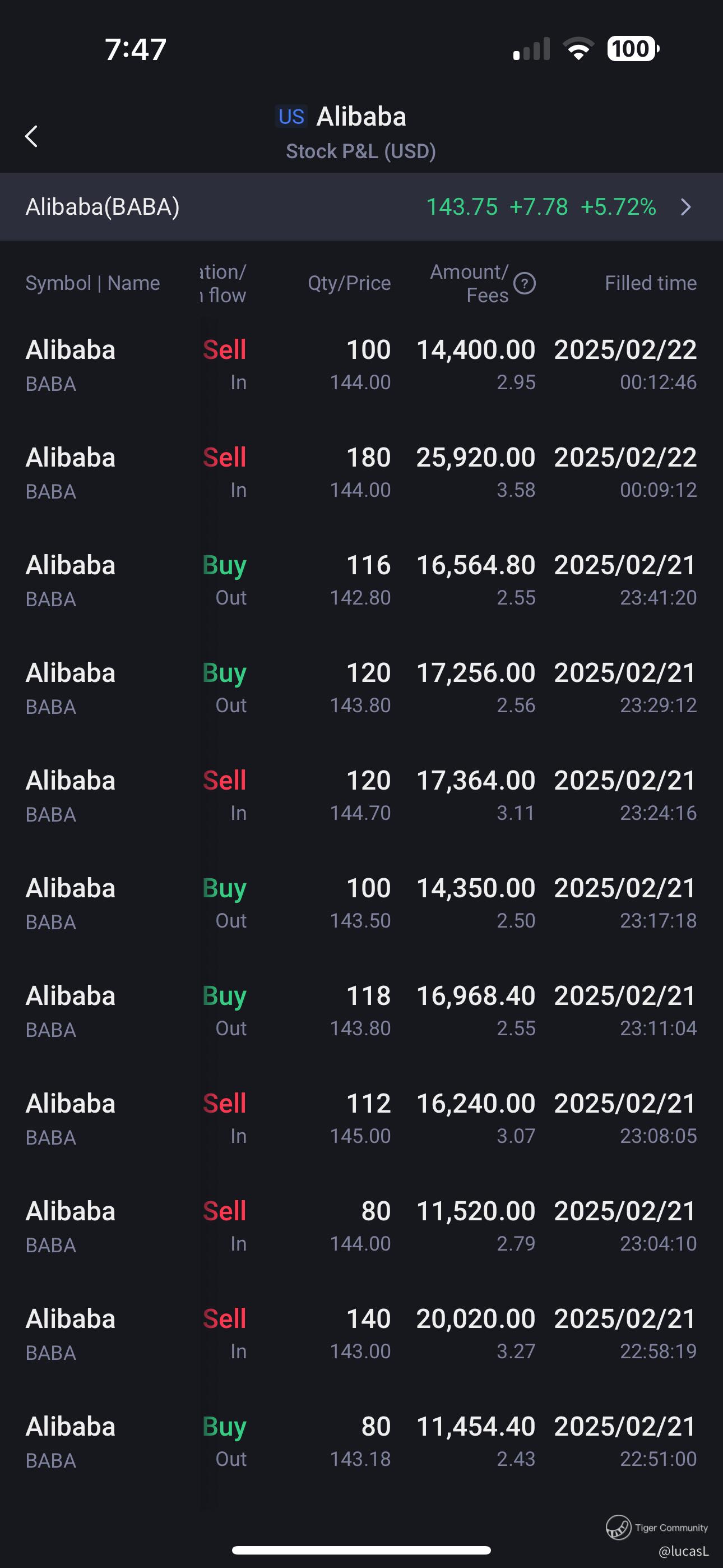 $Alibaba(BABA)$  16 trades done in less than 2 hours. Netting a profit of about 600usd. Could have been a lot more but I fell asleep and did not buy back the 280 shares that I sold @144 back.