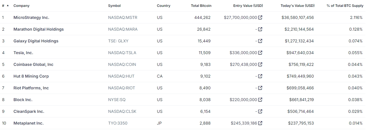 The top 10 companies holding the most Bitcoin: $MicroStrategy(MSTR)$ $Marathon Digital Holdings Inc(MARA)$ $Tesla Motors(TSLA)$ $Hut 8 Mining Corp(HUT)$ $Coinbase Global, Inc.(COIN)$,$Galaxy Digital Holdings Ltd.(BRPHF)$ $Block(SQ)$ $Riot Platforms(RIOT)$ $Bitcoin Group SE(BTGGF)$ $CleanSpark, Inc.(CLSK)$ and $MicroStrategy(MSTR)$ worth look at.