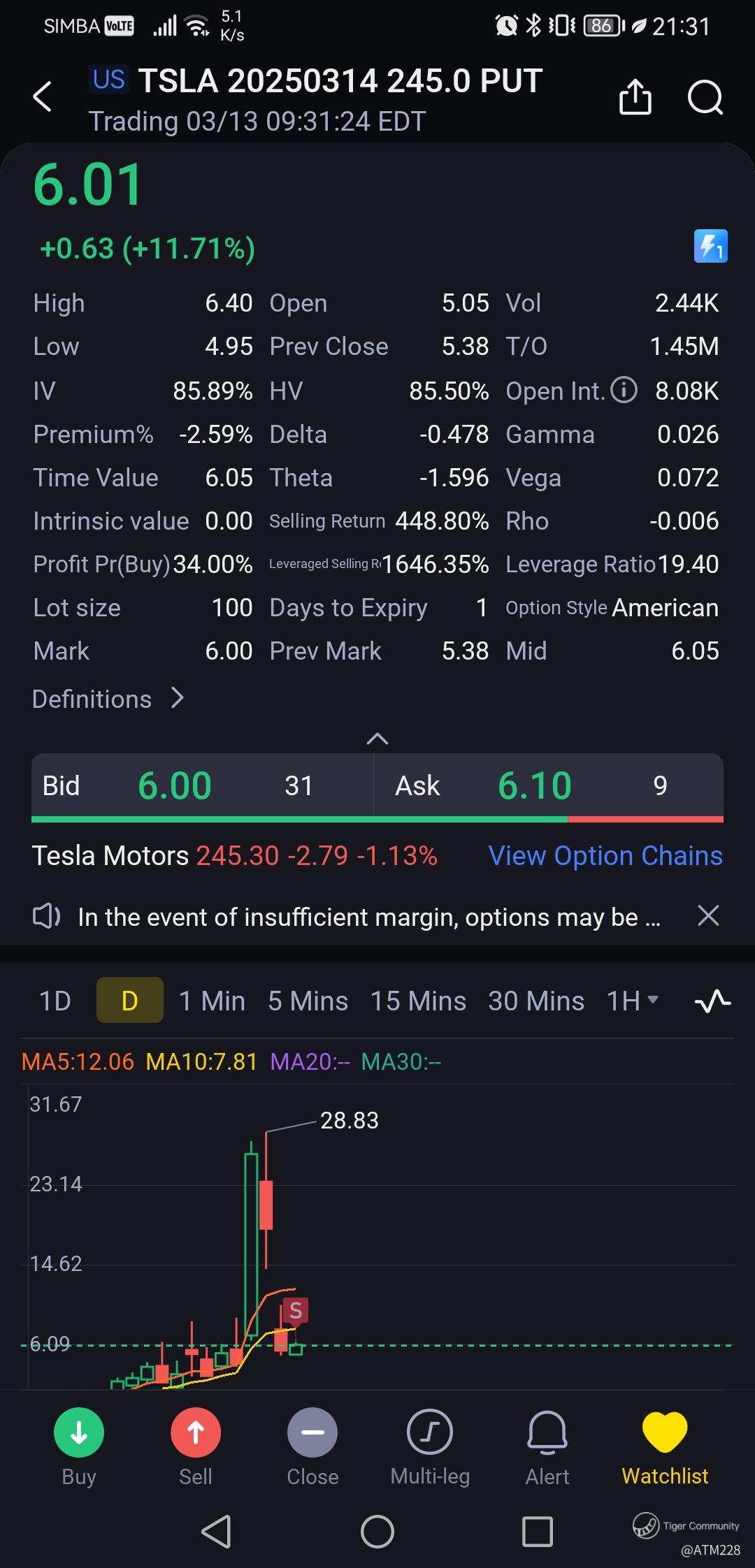 $TSLA 20250314 245.0 PUT$ STO this $245P on 13Mar, 2 DTE, $6.00 or 2.4%, delta - 0.478, IV 85.89%